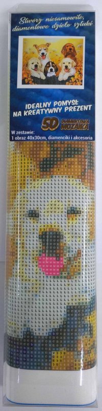 Balení obsahuje: plátno s předtištěným obrázkem, pero na aplikaci kamínků, misku na vysypání kamínků, vosk na nalepení, sadu barevných kamínků Diamantové malování - postup: Horní strana plátna je potažena lepidlem a překrytá průhlednou folií. Folii sundávejte postupně po částech tak, jak budete aplikovat kamínky. Při sejmutí celé folie najednou se může lepicí vrstva znečistit a kamínky by nemusely tak dobře držet. Plátno obsahuje znaky, které jsou uvedeny v přiložené legendě a odkazují na příslušný sáček s kamínky označený číslem. Kamínky z daného sáčku vysypejte do misky. Do hrotu pera naberte vosk, díky kterému se kamínky snadno přichytí na pero. Kamínky perem nanášejte na obrázek. Po nalepení dané barvy kamínky nasypejte zpět do sáčku a pokračujte s další barvou.