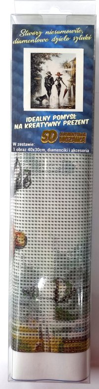Balení obsahuje: plátno s předtištěným obrázkem, pero na aplikaci kamínků, misku na vysypání kamínků, vosk na nalepení, sadu barevných kamínků Diamantové malování - postup: Horní strana plátna je potažena lepidlem a překrytá průhlednou folií. Folii sundávejte postupně po částech tak, jak budete aplikovat kamínky. Při sejmutí celé folie najednou se může lepicí vrstva znečistit a kamínky by nemusely tak dobře držet. Plátno obsahuje znaky, které jsou uvedeny v přiložené legendě a odkazují na příslušný sáček s kamínky označený číslem. Kamínky z daného sáčku vysypejte do misky. Do hrotu pera naberte vosk, díky kterému se kamínky snadno přichytí na pero. Kamínky perem nanášejte na obrázek. Po nalepení dané barvy kamínky nasypejte zpět do sáčku a pokračujte s další barvou.