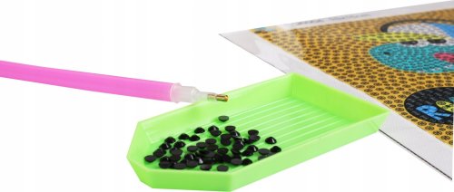 Diamantové malování - postup: Kamínky vysypejte do misky. Do hrotu pera naberte vosk, díky kterému se kamínky snadno přichytí na pero. Kamínky perem nanášejte na obrázek. Po nalepení dané barvy kamínky nasypejte zpět do sáčku a pokračujte s další barvou.