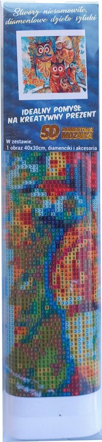 Balení obsahuje: plátno s předtištěným obrázkem, pero na aplikaci kamínků, misku na vysypání kamínků, vosk na nalepení, sadu barevných kamínků Diamantové malování - postup: Horní strana plátna je potažena lepidlem a překrytá průhlednou folií. Folii sundávejte postupně po částech tak, jak budete aplikovat kamínky. Při sejmutí celé folie najednou se může lepicí vrstva znečistit a kamínky by nemusely tak dobře držet. Plátno obsahuje znaky, které jsou uvedeny v přiložené legendě a odkazují na příslušný sáček s kamínky označený číslem. Kamínky z daného sáčku vysypejte do misky. Do hrotu pera naberte vosk, díky kterému se kamínky snadno přichytí na pero. Kamínky perem nanášejte na obrázek. Po nalepení dané barvy kamínky nasypejte zpět do sáčku a pokračujte s další barvou.