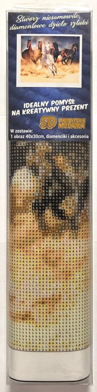 Balení obsahuje: plátno s předtištěným obrázkem, pero na aplikaci kamínků, misku na vysypání kamínků, vosk na nalepení, sadu barevných kamínků Diamantové malování - postup: Horní strana plátna je potažena lepidlem a překrytá průhlednou folií. Folii sundávejte postupně po částech tak, jak budete aplikovat kamínky. Při sejmutí celé folie najednou se může lepicí vrstva znečistit a kamínky by nemusely tak dobře držet. Plátno obsahuje znaky, které jsou uvedeny v přiložené legendě a odkazují na příslušný sáček s kamínky označený číslem. Kamínky z daného sáčku vysypejte do misky. Do hrotu pera naberte vosk, díky kterému se kamínky snadno přichytí na pero. Kamínky perem nanášejte na obrázek. Po nalepení dané barvy kamínky nasypejte zpět do sáčku a pokračujte s další barvou.