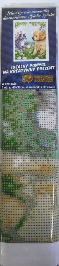 Balení obsahuje: plátno s předtištěným obrázkem, pero na aplikaci kamínků, misku na vysypání kamínků, vosk na nalepení, sadu barevných kamínků Diamantové malování - postup: Horní strana plátna je potažena lepidlem a překrytá průhlednou folií. Folii sundávejte postupně po částech tak, jak budete aplikovat kamínky. Při sejmutí celé folie najednou se může lepicí vrstva znečistit a kamínky by nemusely tak dobře držet. Plátno obsahuje znaky, které jsou uvedeny v přiložené legendě a odkazují na příslušný sáček s kamínky označený číslem. Kamínky z daného sáčku vysypejte do misky. Do hrotu pera naberte vosk, díky kterému se kamínky snadno přichytí na pero. Kamínky perem nanášejte na obrázek. Po nalepení dané barvy kamínky nasypejte zpět do sáčku a pokračujte s další barvou.
