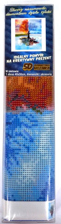 Balení obsahuje: plátno s předtištěným obrázkem, pero na aplikaci kamínků, misku na vysypání kamínků, vosk na nalepení, sadu barevných kamínků Diamantové malování - postup: Horní strana plátna je potažena lepidlem a překrytá průhlednou folií. Folii sundávejte postupně po částech tak, jak budete aplikovat kamínky. Při sejmutí celé folie najednou se může lepicí vrstva znečistit a kamínky by nemusely tak dobře držet. Plátno obsahuje znaky, které jsou uvedeny v přiložené legendě a odkazují na příslušný sáček s kamínky označený číslem. Kamínky z daného sáčku vysypejte do misky. Do hrotu pera naberte vosk, díky kterému se kamínky snadno přichytí na pero. Kamínky perem nanášejte na obrázek. Po nalepení dané barvy kamínky nasypejte zpět do sáčku a pokračujte s další barvou.