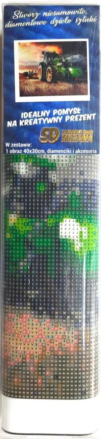 Balení obsahuje: plátno s předtištěným obrázkem, pero na aplikaci kamínků, misku na vysypání kamínků, vosk na nalepení, sadu barevných kamínků Diamantové malování - postup: Horní strana plátna je potažena lepidlem a překrytá průhlednou folií. Folii sundávejte postupně po částech tak, jak budete aplikovat kamínky. Při sejmutí celé folie najednou se může lepicí vrstva znečistit a kamínky by nemusely tak dobře držet. Plátno obsahuje znaky, které jsou uvedeny v přiložené legendě a odkazují na příslušný sáček s kamínky označený číslem. Kamínky z daného sáčku vysypejte do misky. Do hrotu pera naberte vosk, díky kterému se kamínky snadno přichytí na pero. Kamínky perem nanášejte na obrázek. Po nalepení dané barvy kamínky nasypejte zpět do sáčku a pokračujte s další barvou.