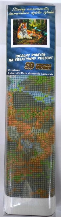 Balení obsahuje: plátno s předtištěným obrázkem, pero na aplikaci kamínků, misku na vysypání kamínků, vosk na nalepení, sadu barevných kamínků Diamantové malování - postup: Horní strana plátna je potažena lepidlem a překrytá průhlednou folií. Folii sundávejte postupně po částech tak, jak budete aplikovat kamínky. Při sejmutí celé folie najednou se může lepicí vrstva znečistit a kamínky by nemusely tak dobře držet. Plátno obsahuje znaky, které jsou uvedeny v přiložené legendě a odkazují na příslušný sáček s kamínky označený číslem. Kamínky z daného sáčku vysypejte do misky. Do hrotu pera naberte vosk, díky kterému se kamínky snadno přichytí na pero. Kamínky perem nanášejte na obrázek. Po nalepení dané barvy kamínky nasypejte zpět do sáčku a pokračujte s další barvou.