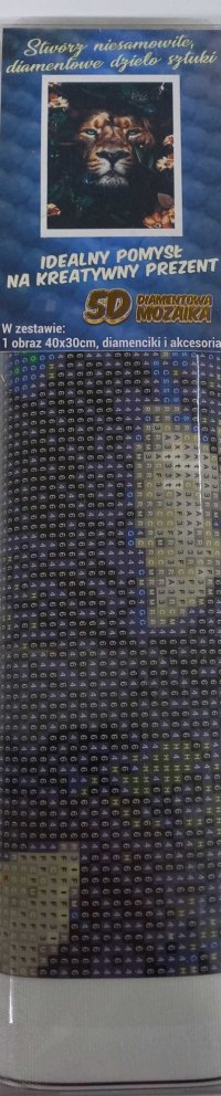 Balení obsahuje: plátno s předtištěným obrázkem, pero na aplikaci kamínků, misku na vysypání kamínků, vosk na nalepení, sadu barevných kamínků Diamantové malování - postup: Horní strana plátna je potažena lepidlem a překrytá průhlednou folií. Folii sundávejte postupně po částech tak, jak budete aplikovat kamínky. Při sejmutí celé folie najednou se může lepicí vrstva znečistit a kamínky by nemusely tak dobře držet. Plátno obsahuje znaky, které jsou uvedeny v přiložené legendě a odkazují na příslušný sáček s kamínky označený číslem. Kamínky z daného sáčku vysypejte do misky. Do hrotu pera naberte vosk, díky kterému se kamínky snadno přichytí na pero. Kamínky perem nanášejte na obrázek. Po nalepení dané barvy kamínky nasypejte zpět do sáčku a pokračujte s další barvou.