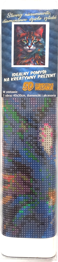 Balení obsahuje: plátno s předtištěným obrázkem, pero na aplikaci kamínků, misku na vysypání kamínků, vosk na nalepení, sadu barevných kamínků Diamantové malování - postup: Horní strana plátna je potažena lepidlem a překrytá průhlednou folií. Folii sundávejte postupně po částech tak, jak budete aplikovat kamínky. Při sejmutí celé folie najednou se může lepicí vrstva znečistit a kamínky by nemusely tak dobře držet. Plátno obsahuje znaky, které jsou uvedeny v přiložené legendě a odkazují na příslušný sáček s kamínky označený číslem. Kamínky z daného sáčku vysypejte do misky. Do hrotu pera naberte vosk, díky kterému se kamínky snadno přichytí na pero. Kamínky perem nanášejte na obrázek. Po nalepení dané barvy kamínky nasypejte zpět do sáčku a pokračujte s další barvou.