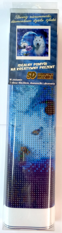 Balení obsahuje: plátno s předtištěným obrázkem, pero na aplikaci kamínků, misku na vysypání kamínků, vosk na nalepení, sadu barevných kamínků Diamantové malování - postup: Horní strana plátna je potažena lepidlem a překrytá průhlednou folií. Folii sundávejte postupně po částech tak, jak budete aplikovat kamínky. Při sejmutí celé folie najednou se může lepicí vrstva znečistit a kamínky by nemusely tak dobře držet. Plátno obsahuje znaky, které jsou uvedeny v přiložené legendě a odkazují na příslušný sáček s kamínky označený číslem. Kamínky z daného sáčku vysypejte do misky. Do hrotu pera naberte vosk, díky kterému se kamínky snadno přichytí na pero. Kamínky perem nanášejte na obrázek. Po nalepení dané barvy kamínky nasypejte zpět do sáčku a pokračujte s další barvou.