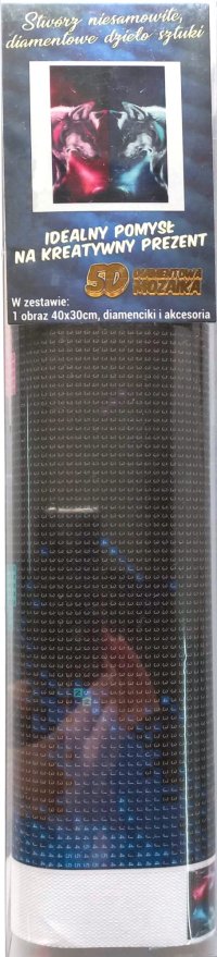 Balení obsahuje: plátno s předtištěným obrázkem, pero na aplikaci kamínků, misku na vysypání kamínků, vosk na nalepení, sadu barevných kamínků Diamantové malování - postup: Horní strana plátna je potažena lepidlem a překrytá průhlednou folií. Folii sundávejte postupně po částech tak, jak budete aplikovat kamínky. Při sejmutí celé folie najednou se může lepicí vrstva znečistit a kamínky by nemusely tak dobře držet. Plátno obsahuje znaky, které jsou uvedeny v přiložené legendě a odkazují na příslušný sáček s kamínky označený číslem. Kamínky z daného sáčku vysypejte do misky. Do hrotu pera naberte vosk, díky kterému se kamínky snadno přichytí na pero. Kamínky perem nanášejte na obrázek. Po nalepení dané barvy kamínky nasypejte zpět do sáčku a pokračujte s další barvou.