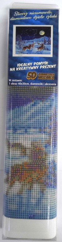 Balení obsahuje: plátno s předtištěným obrázkem, pero na aplikaci kamínků, misku na vysypání kamínků, vosk na nalepení, sadu barevných kamínků Diamantové malování - postup: Horní strana plátna je potažena lepidlem a překrytá průhlednou folií. Folii sundávejte postupně po částech tak, jak budete aplikovat kamínky. Při sejmutí celé folie najednou se může lepicí vrstva znečistit a kamínky by nemusely tak dobře držet. Plátno obsahuje znaky, které jsou uvedeny v přiložené legendě a odkazují na příslušný sáček s kamínky označený číslem. Kamínky z daného sáčku vysypejte do misky. Do hrotu pera naberte vosk, díky kterému se kamínky snadno přichytí na pero. Kamínky perem nanášejte na obrázek. Po nalepení dané barvy kamínky nasypejte zpět do sáčku a pokračujte s další barvou.