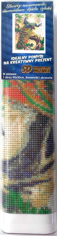 Balení obsahuje: plátno s předtištěným obrázkem, pero na aplikaci kamínků, misku na vysypání kamínků, vosk na nalepení, sadu barevných kamínků Diamantové malování - postup: Horní strana plátna je potažena lepidlem a překrytá průhlednou folií. Folii sundávejte postupně po částech tak, jak budete aplikovat kamínky. Při sejmutí celé folie najednou se může lepicí vrstva znečistit a kamínky by nemusely tak dobře držet. Plátno obsahuje znaky, které jsou uvedeny v přiložené legendě a odkazují na příslušný sáček s kamínky označený číslem. Kamínky z daného sáčku vysypejte do misky. Do hrotu pera naberte vosk, díky kterému se kamínky snadno přichytí na pero. Kamínky perem nanášejte na obrázek. Po nalepení dané barvy kamínky nasypejte zpět do sáčku a pokračujte s další barvou.
