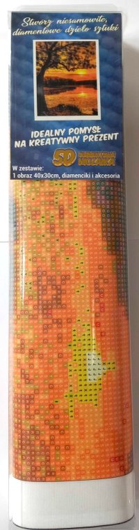 Balení obsahuje: plátno s předtištěným obrázkem, pero na aplikaci kamínků, misku na vysypání kamínků, vosk na nalepení, sadu barevných kamínků Diamantové malování - postup: Horní strana plátna je potažena lepidlem a překrytá průhlednou folií. Folii sundávejte postupně po částech tak, jak budete aplikovat kamínky. Při sejmutí celé folie najednou se může lepicí vrstva znečistit a kamínky by nemusely tak dobře držet. Plátno obsahuje znaky, které jsou uvedeny v přiložené legendě a odkazují na příslušný sáček s kamínky označený číslem. Kamínky z daného sáčku vysypejte do misky. Do hrotu pera naberte vosk, díky kterému se kamínky snadno přichytí na pero. Kamínky perem nanášejte na obrázek. Po nalepení dané barvy kamínky nasypejte zpět do sáčku a pokračujte s další barvou.