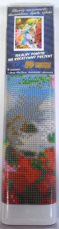 Balení obsahuje: plátno s předtištěným obrázkem, pero na aplikaci kamínků, misku na vysypání kamínků, vosk na nalepení, sadu barevných kamínků Diamantové malování - postup: Horní strana plátna je potažena lepidlem a překrytá průhlednou folií. Folii sundávejte postupně po částech tak, jak budete aplikovat kamínky. Při sejmutí celé folie najednou se může lepicí vrstva znečistit a kamínky by nemusely tak dobře držet. Plátno obsahuje znaky, které jsou uvedeny v přiložené legendě a odkazují na příslušný sáček s kamínky označený číslem. Kamínky z daného sáčku vysypejte do misky. Do hrotu pera naberte vosk, díky kterému se kamínky snadno přichytí na pero. Kamínky perem nanášejte na obrázek. Po nalepení dané barvy kamínky nasypejte zpět do sáčku a pokračujte s další barvou.