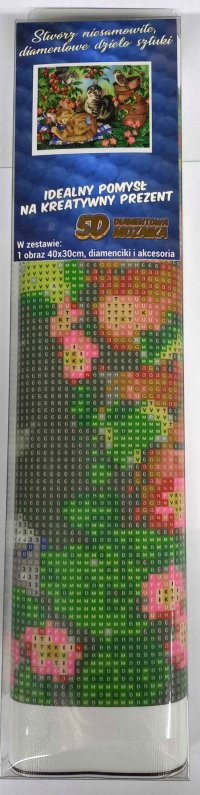 Balení obsahuje: plátno s předtištěným obrázkem, pero na aplikaci kamínků, misku na vysypání kamínků, vosk na nalepení, sadu barevných kamínků Diamantové malování - postup: Horní strana plátna je potažena lepidlem a překrytá průhlednou folií. Folii sundávejte postupně po částech tak, jak budete aplikovat kamínky. Při sejmutí celé folie najednou se může lepicí vrstva znečistit a kamínky by nemusely tak dobře držet. Plátno obsahuje znaky, které jsou uvedeny v přiložené legendě a odkazují na příslušný sáček s kamínky označený číslem. Kamínky z daného sáčku vysypejte do misky. Do hrotu pera naberte vosk, díky kterému se kamínky snadno přichytí na pero. Kamínky perem nanášejte na obrázek. Po nalepení dané barvy kamínky nasypejte zpět do sáčku a pokračujte s další barvou.