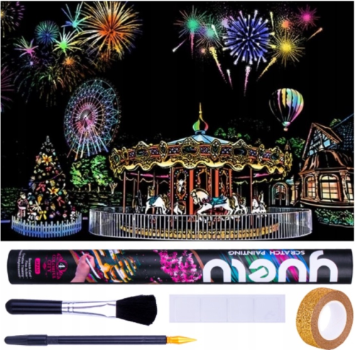 Škrabací obrázek s motivem zábavního parku. Obsah balení: