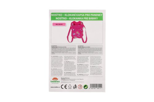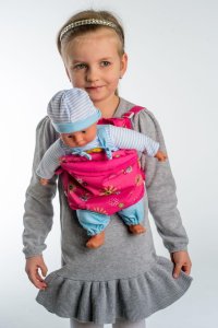 Dětské nosítko pro holčičky, ve kterém mohou nosit své panenky a medvídky. Rozměr klokaní kapsy je 29 x 20 cm, u popruhů je délka nastavitelná.