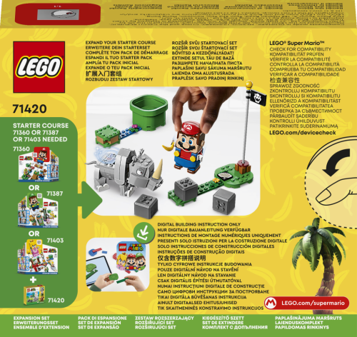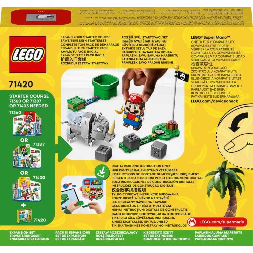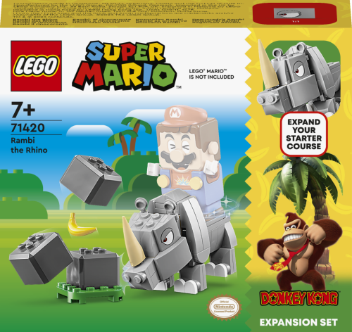 Připravte se na dobrodružství s rozšiřujícím setem LEGO® Super Mario™ (71420) Nosorožec Rambi – rozšiřující set pro děti od 7 let. Obsahuje figurku Rambiho z kostek LEGO®, na které mohou jezdit interaktivní figurky LEGO® Mario™, LEGO® Luigi™ nebo LEGO® Peach™ (nejsou součástí balení). Když Rambi chodí, běží proti vrstvitelným prvkům kamenů a jinak se hýbe, aktivují se zvukové efekty interaktivní figurky. Poznámka: Pro interaktivní herní zážitek je zapotřebí některý ze startovacích setů 71360, 71387 nebo 71403.