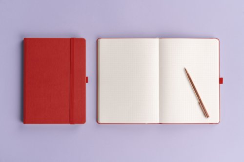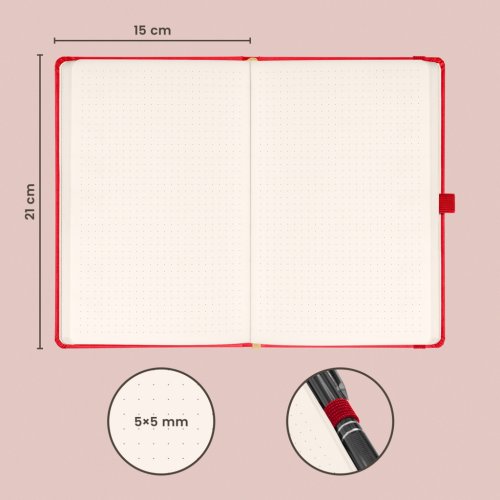 Tečkovaný notes Aprint v červeném provedení. Klasika i elegance, nejžádanější povrch, na který lze snadno razit firemní loga s jemnou strukturou.