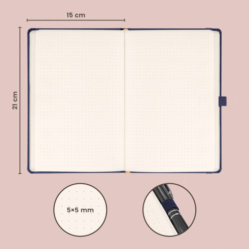 Tečkovaný notes Balacron v tmavě modrém provedení. Povrch diáře si získal oblibu díky kvalitnímu svrchnímu materiálu, který je extrémně odolný vůči vnějšímu poškození.