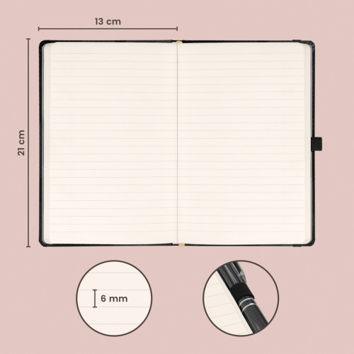 Kvalitní linkovaný notes v pevných deskách s uzavíráním na gumičku, poutkem na tužku a vnitřní kapsou na drobnosti. Uvnitř najdete 172 tečkovaných stran na žlutém papíře pro zapsání všech vašich nápadů. Linkovaný zápisník můžete použít jako deník, psát do něj hluboké myšlenky nebo pracovní poznámky.