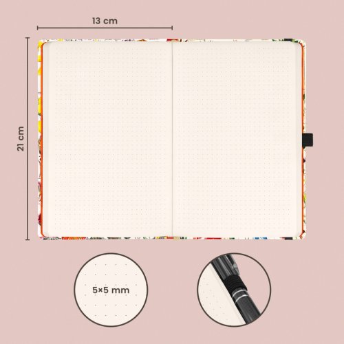 Notes v pevných deskách z kolekce Kateřiny Winterové s ilustracemi květin, s uzavíráním na gumičku, kapsou na drobnosti a poutkem na tužku. Vevnitř najdete 172 tečkovaných stran na žlutém papíře pro zapsání všech vašich nápadů.