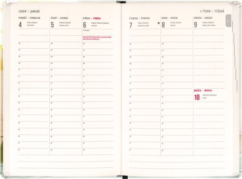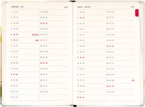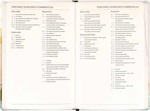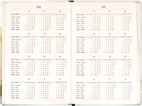 Osmnáctiměsíční diář obsahuje přehled na rok 2026 a 2027, seznam českých a slovenských jmen a česko-slovenské týdenní sloupcové kalendárium se jmény a svátky. Kalendárium začíná v červenci 2026 a končí v prosinci 2027.