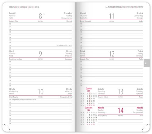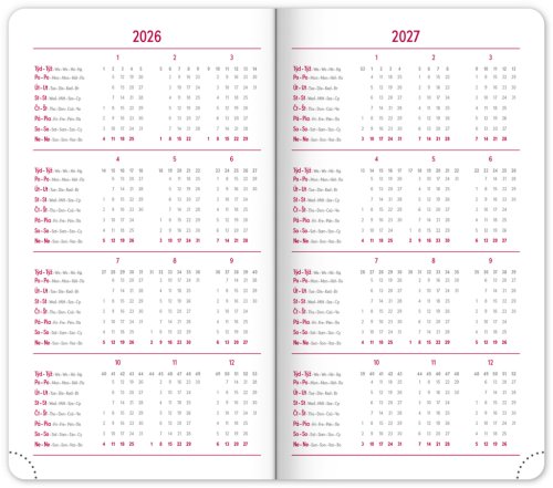 Kapesní diář Aprint 2026 v červené barvě. Kolekce vsadila na osvědčené barvy, které doplňuje nová ražba letopočtu. Týdenní rozvrh s česko-slovenským kalendáriem a doplňkovou angličtinou, němčinou, maďarštinou a ruštinou.