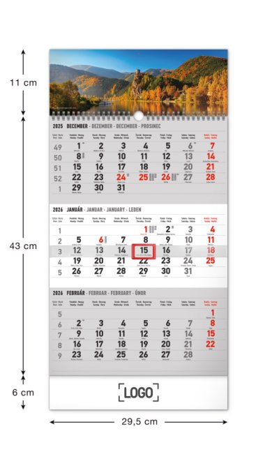 Praktický plánovací kalendář s tříměsíčním rozložením, orientační lištou s posuvným jezdcem a užitečným ročním přehledem. Obsahuje kalendárium se slovenskými jmény a světovými svátky na tmavě modrém pozadí.