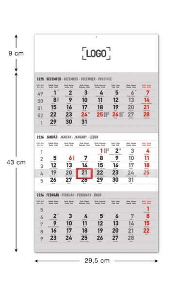 Praktický plánovací kalendář s tříměsíčním rozložením a orientační lištou s posuvným jezdcem. Obsahuje kalendárium se slovenskými jmény a světovými svátky na šedém pozadí.