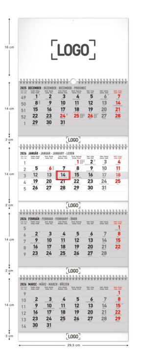 Praktický čtyřměsíční kalendář s plochou pro potisk a náhledem čtyř měsíců současně můžete díky dvojité spirále pohodlně složit do obálky velikosti A4. Kalendárium obsahuje slovenská jména a světové svátky. Díky volné ploše pro potisk se může stát zcela originálním předmětem pro firmy.