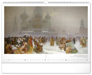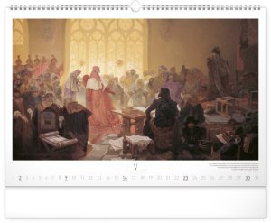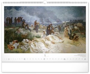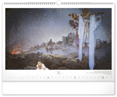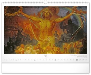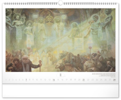 Nástěnný kalendář s reprodukcemi známých obrazů Slovanské epopeje od českého secesního malíře Alfonse Muchy. Reprodukce doplňuje vkusné univerzální kalendárium s vyznačenými nedělemi a popisky obrazů ve čtyřech jazycích (CZ, SK, EN, DE).