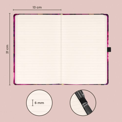 Kvalitní linkovaný notes v pevných deskách s uzavíráním na gumičku, poutkem na tužku a vnitřní kapsou na drobnosti.