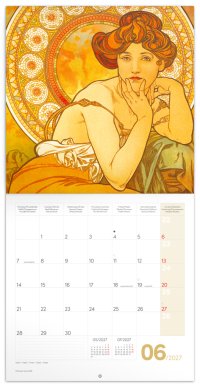 Poznámkový kalendář s reprodukcemi nejznámějších obrazů českého secesního malíře Alfonse Muchy, známého nejen svou tvorbou plakátů se Sarah Bernhardtovou. Obsahuje přehledné kalendárium od září 2026 do prosince 2027 v šesti jazycích, měsíční fáze, důležité svátky a prostor pro poznámky na každý den.