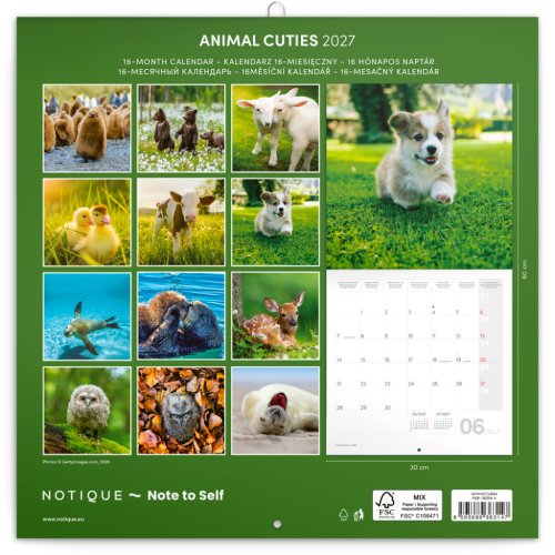 Fotografie roztomilých medvíďat, jehňat nebo tuleňů vám budou dělat radost celý rok. V kalendáři kromě fotek najdete přehledné kalendárium od září 2026 do prosince 2027 v šesti jazycích, měsíční fáze, důležité svátky a prostor pro poznámky na každý den.
