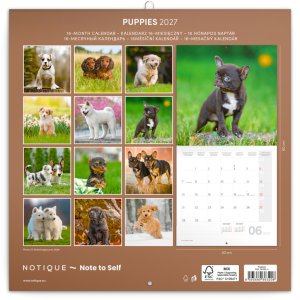 Roztomilá štěňátka na fotografiích v poznámkovém kalendáři. Uvnitř najdete přehledné kalendárium od září 2026 do prosince 2027 v šesti jazycích, měsíční fáze, důležité svátky a prostor pro poznámky na každý den.