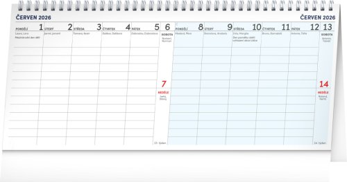 Ve 14-denním stolním kalendáři je mnoho prostoru pro poznámky, dále české kalendárium, svátky a památné dny i měsíční fáze. To vše v přehledném dvoutýdenním rozvržení.