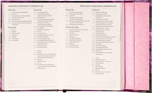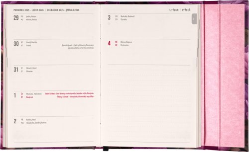 Týdenní diář s praktickým magnetickým uzavíráním je ideální volbou pro ty, kteří chtějí mít své plány přehledně pod kontrolou. Horizontální rozložení s českým a slovenským kalendáriem ve verzi týden na dvou stranách s prostorem pro poznámky. Součástí jsou praktické měsíční přehledy, ideální pro plánování dovolených či prázdnin, a také seznam českých a slovenských svátků a jmenin.