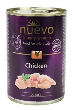 Konzervou Nuevo kočka adult Kuře potěšíte každou vybíravou kočičku a dopřeje jí tak nezapomenutelný gurmánský zážitek. Konzerva je bohatá na vysoký podíl kvalitního masa (71%) s velkým množstvím cenných bílkovin je odpovědí na individuální potřeby citlivé kočky – pouze čerstvé maso obohacené o esenciální vitamíny a minerály. Výborný zdroj energie, výborně stravitelná a obzvláště chutná strava.