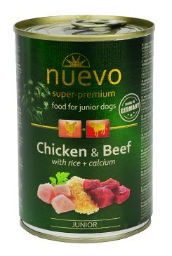 Masová konzerva pro štěňata a mladé psy Nuevo Junior Kuřecí a Hovězí konzerva dodává ty správné výživné látky podporující zdravý růst. Vysoký obsah čerstvého kuřecího a hovězího masa dodává bílkoviny vysoké biologické hodnoty. Vyvážená komplexní výživa se správnou úrovní bílkovin, tuků, minerálů a vitamínů. Její složení podporuje imunitu a pohyblivost vašeho psa. Žádná umělá barviva, žádné příchutě či konzervační látky, a to od samotného začátku!