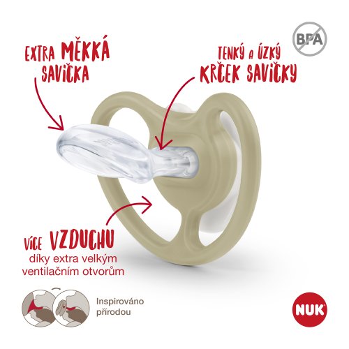 • Vylepšený tvar dudlíku NUK – dudlík má stejný tvar jako matčina bradavka při kojení, dokonale padne do úst dítěte při sání