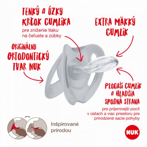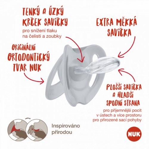 Průhledný silikonový materiál se snadno čistí a je zvláště odolný vůči teplu. Neobsahuje škodlivé látky, je odolný proti varu, bez zápachu, transparentní a má hladký povrch. Všechny dudlíky NUK disponují air-systemem NUK, který umožňuje, aby jemná pokožka miminka mohla dýchat.