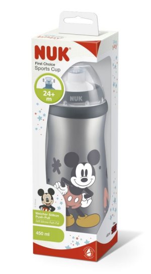 NUK FC Láhev Sports Cup, Disney - Mickey 450 ml, SI push-pull pítko. Mluví, dovádějí, stojí na vlastních nohou a pijí bez Vaší pomoci. Změn, kterými si vaši nejmenší prošli v prvních třech letech života, je nespočet. Není proto divu, že se musí měnit i jejich lahvičky. Aby mohly Vaše děti zahánět žízeň i během jejich sportování, byly naše lahvičky vybaveny nekapajícím push-pull pítkem, se kterým bude hračka lahvičku používat. Hlavní vlastnosti: ideální pro děti od 3 let, na hry a sport s nekapajícím push-pull (vytahovacím-zatlačovacím) pítkem součástí je praktické víčko, které udržuje pítko hygienické a klip, pomocí kterého můžete lahvičku připnout k batohu či za pásek (pro větší děti) extra lehká a nekapající lahvička, vhodná i pro mytí v myčce lze zakoupit náhradní pítko neobsahuje BPA k dispozici ve dvou atraktivních provedeních s veselým motivem Mickeyho Mouse