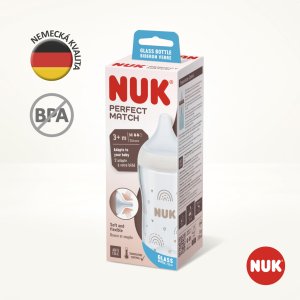 Skleněná kojenecká láhev NUK Perfect Match, s měkkou silikonovou savičkou, 230 ml, od 3 měsíců, neobsahuje BPA, antikolikový systém, s kontrolou teploty