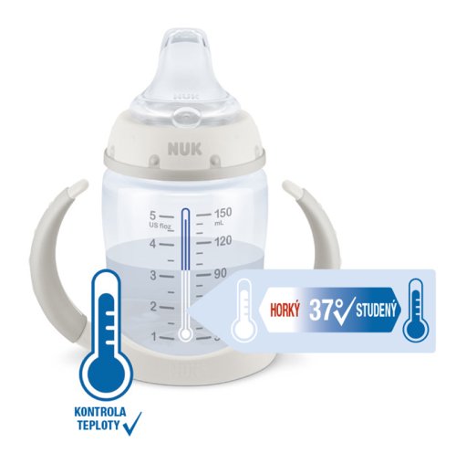 Lahvička na učení First Chioce značky NUK má měkké silikonové pítko s antikolikovým systémem, takže minimalizuje vznik koliky.Lahvička je určená pro děti od 6 do 18 měsíců. Praktické držadla se postarají o bezpečný úchop a snadný přechod na samostatné pití. Indikátor kontroly teploty – modrá barva se změní na bílou, pokud je obsah příliš horký.