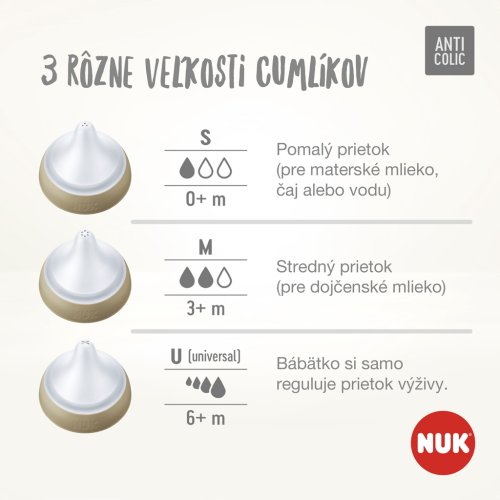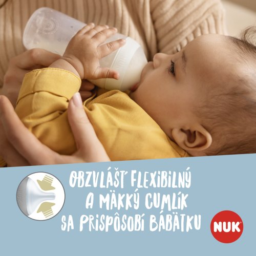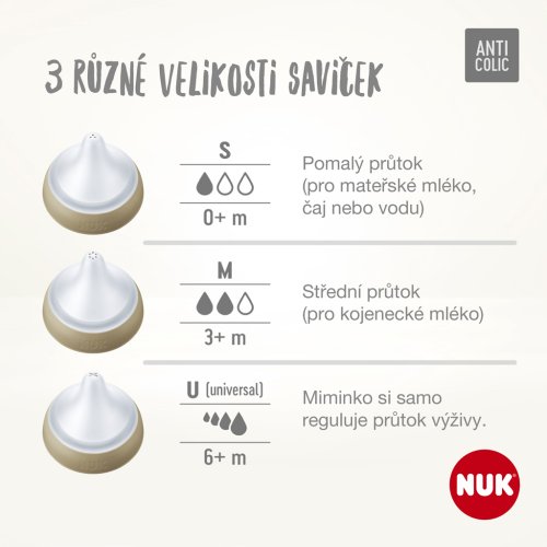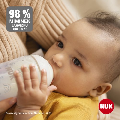 Upozornění k použití: Před prvním použitím rozložte výrobek na jednotlivé díly, tyto vyčistěte a na 5 minut umístěte do vroucí vody. Slouží to hygienickým účelům. Před každým dalším použitím pečlivě vyčistěte. V případě potřeby sterilizujte. Uchovávejte v suchu a hygienicky. Při čištění používejte mycí prostředek NUK nebo jemný prostředek pro ruční mytí a zbytky potravin odstraňte také ze skrytých oblastí. Jeli zapotřebí, výrobek namočte, v žádném případě neškrábejte vnitřek láhve. Důkladně propláchněte. Savičky a láhve nepatří do myčky – hrozí poškození materiálu působením čisticích prostředků pro myčky! Některé potraviny mohou způsobit zabarvení materiálu (např. mrkvová šťáva) nebo způsobit zápach (např. fenyklový čaj). To neomezuje vhodnost použití. Pokud láhev vykazuje na vnitřní straně poškození (např. škrábance), musí být z hygienických důvodů vyměněna. Při vyvařování nebo napařování láhev vždy rozložte na jednotlivé díly a nechte otevřené, protože jinak může dojít k jejich deformacím. Při napařování doporučujeme parní sterilizátor NUK nebo NUK parní sterilizátor do mikrovlnných trub. K zabránění poškození materiálu vždy dodržujte návod k použití sterilizátoru. Při dezinfekci plastových lahví nesmí být překročena maximální teplota 100°C (pokyn na lahvi)! Barvy měnící se podle teploty jsou citlivé na vlhké teplo a odvápňovací prostředky. Při častém vaporizování nebo vyvařování dochází k vyblednutí barev.Pro savičku na krmení: Před každým použitím zkontrolujte savičku na krmení a roztáhněte ji do všech směrů. Při prvních známkách poškození nebo slabých míst zlikvidujte. Před každým použitím zkontrolujte mírným roztažením průchodnost odvzdušňovacího ventilu a otvoru na pití. Neponořujte do léčiv! Savičku na krmení nebo lahev nikdy nevystavujte přímému slunečnímu záření nebo teplu nebo ji nenechávejte déle než je uvedeno v desinfekčním prostředku (sterilizační roztok), může to snížit pevnost savičky nebo poškodit materiál. Savičku z hygienických a bezpečnostních důvodů vyměňujte každé 1 až 2 měsíce. Pro LATEXOVÉ savičky: Vyrobeny z přírodního kaučukového latexu. Pro skleněné láhve: K promíchání v láhvi nepoužívejte kovové lžíce, protože přitom mohou vzniknout vlasové trhliny, které mohou později vyvolat prasknutí. Při vyšroubování / zašroubování lahve nikdy nepoužívejte násilí. Lahev při minimálních známkách poškození jako jsou trhlinky atd. vyměňte. Lahve vždy ohřívejte otevřené (nebezpečí výbuchu) a ochlaďte (deformace)! Při ohřívání v mikrovlnné troubě je důležitá opatrnost; může dojít k místnímu přehřátí. Ohřáté potraviny se musí vždy promíchat a před krmením se musí zkontrolovat teplota.