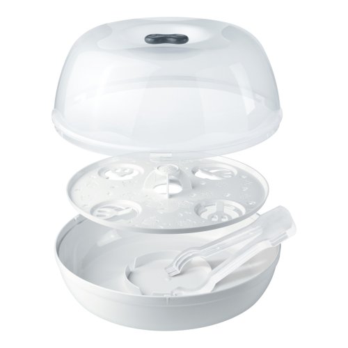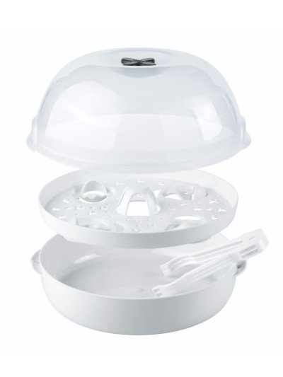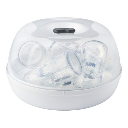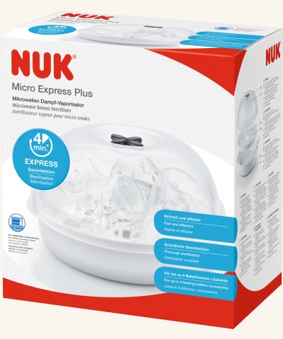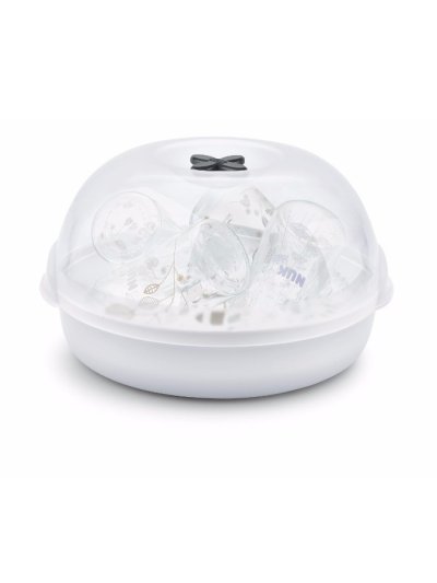 Miminka vyžadují důkladnou péči – předevšim v oblasti krmení. Aby bylo jednoduché vaše děti několikrát denně nakrmit a pokaždé mít k dispozici čistou a sterilizovanou lahvičku, vytvořili jsme sterilizátor do mikrovlnky, který účinně sterilizuje jakékoliv NUK výrobky během pouhých 4 minut. Parní sterilizátor do mikrovlnné trouby Micro Express Plus sterilizuje kojenecké lahve (PA láhve nejsou pro toto zařízení vhodné), jejich příslušenství (kromě dudlíků) a části prsní pumpy. S použitím páry dokáže sterilizovat až čtyři 300 mililitrové lahve se širokým hrdlem zároveň a díky chytrému držáku jsou lahve ve správné poloze pro vysušení. Sterilizované předměty lze poté lehce vyjmout pomocí praktických kleští. Parní sterilizátor do mikrovlnné trouby Micro Express Plus má pouhé tři součásti, a proto je jeho použití snadné. Vejde se do každé standardní mikrovlnné trouby s minimálním vnitřním prostorem o výšce 187 mm a šířce a hloubce 280 mm. Současně je slučitelný a lze jej použít se standardními lahvemi všech tvarů a velikostí, pokud jsou z materiálu, který je možné vystavit působení mikrovlnného záření. Parní sterilizátor do mikrovlnné trouby se hodí pro láhve všech tvarů a velikostí, které jsou vyrobeny z materiálů vhodných pro mikrovlnné trouby. Má průhledné víko a nyní se nově dodává s blokovacím systémem. Po skončení sterilizace jej stačí otřít hadříkem, a pokud by potřeboval vyčištění, lze jej umývat i v myčce nádobí. Součástí balení jsou kleště na lahve pro hygienické vyjmutí. Hlavní vlastnosti: spolehlivé desinfikování během pouhých 4 minutspeciálně navržený držák lahví umožní umístění až 4 lahví o obsahu 300 ml včetně příslušenstvíideální pro každodenní sterilizaci kojeneckých lahví (kromě PA láhví) a příslušenství, které jsou vhodné do mikrovlnné troubysterilizuje až čtyři lahve a příslušenství za pouhé čtyři minuty (nastavení výkonu na 1 000 wattů)snadná obsluhapozor na minimální potřebnou velikost mikrovlnné trouby