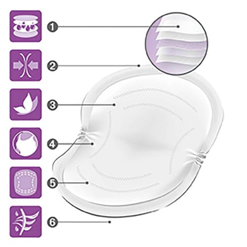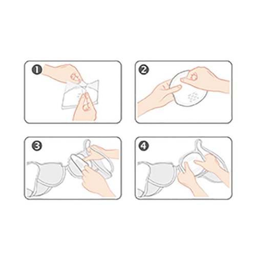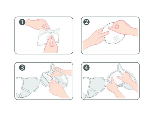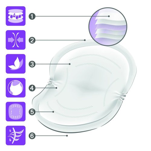 Bezpečnostní pokyny: Výrobek a obal uchovávejte mimo dosah dětí. Před použitím prsní polštářek odklopte a z fixačního proužku stáhněte ochrannou fólii. Prsní polštářky jsou určeny k jednorázovému použití a mění se podle potřeby. Likvidujte podle předpisu, nevhazuje do toalety.