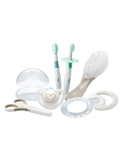 Dokonalá první výbavička pro novorozence v kosmetické taštičce – vhodný také jako dárek! Sada 8 výrobků.