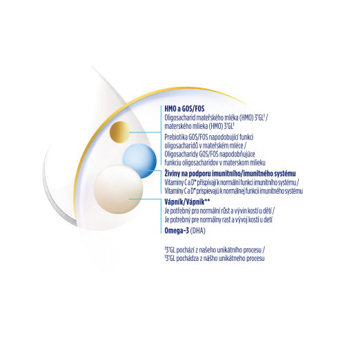 Složení: Laktóza (z MLÉKA), sušené odtučněné MLÉKO, maltodextrin, galaktooligosacharidy (z MLÉKA) 8,6 %, demineralizovaná syrovátka (z MLÉKA), koncentrát syrovátkové bílkoviny (z MLÉKA), rostlinné oleje (řepkový, slunečnicový, slunečnicový s vysokým obsahem kyseliny olejové, kokosový), fosforečnan vápenatý, fruktooligosacharidy 0,6 %, uhličitan vápenatý, RYBÍ olej, citronan draselný, hydrogenfosforečnan hořečnatý, citronan sodný, chlorid draselný, kyselina L-askorbová, emulgátor (SÓJOVÝ lecitin), chlorid cholinu, aroma (vanilin), síran železnatý, inositol, chlorid hořečnatý, L-askorban sodný, síran zinečnatý, antioxidant (askorbylpalmitát), D-pantothená vápenatý, DL-α-tokoferyl acetát, nikotinamid, riboflavin, retinylpalmitát, cholekalciferol, pyridoxin hydrochlorid, thiamin hydrochlorid, jodid draselný, kyselina pteroylmonoglutamová (kyselina listová), fytomenadion, D-biotin, kyanokobalamin Složení se vztahuje k sušenému stavu potraviny