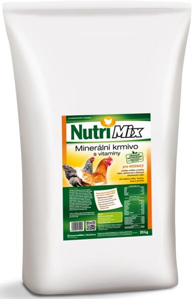 Nutrimix pro Nosnice je určen pro doplnění minerálních látek a vitaminů do krmných dávek pro slepice, kachny, husy, krůty nebo perličky chované v drobnochovech. Podporuje zvýšení snášky, oplozenost a líhnivost násadových vajec. Zajišťuje dobrý zdravotní stav drůbeže a zlepšuje využití přijatých krmiv. Přidává se do krmné dávky, která je založena na obilných šrotech nebo jiných neplnohodnotných krmivech, popř. kuchyňských zbytcích atd. Složení: vápník 280 g, fosfor 40 g, sodík 9 g, lysin 1,3 g, methionin 10 g, threonin 1 g, vitamin A 180 000 m.j., vitamin D3 30 000 m.j., vitamin E 150 mg, vitamin K3 15 mg, vitamin B1 20 mg, vitamin B2 50 mg, niacinamid 150 mg, pantothenan vápenatý 80 mg, vitamin B6 20 mg, vitamin B12 0,1 mg, betain 3 000 mg, železo 500 mg, zinek 460 mg, mangan 890 mg, jod 3,2 mg, selen 1,4 mg, přírodní antioxidant 60 mg, bylinné extrakty na zlepšení stravitelnosti krmné dávky 1 900 mg. Způsob použití a dávkování: Odměřené množství přípravku se podává denně rovnoměrně zamíchané do krmiva. Je nutné zajistit trvalý přístup k zdravotně nezávadné vodě. Slepice, kachny, husy, krůty, perličky: V období snášky 100 g/10 ks/den. V období snáškového klidu 60 g/10 ks/den.